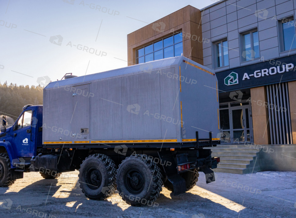 Утеплена пенополистиролом , имеет утепленные люки для возможности обслуживания трансмиссии из фургона |